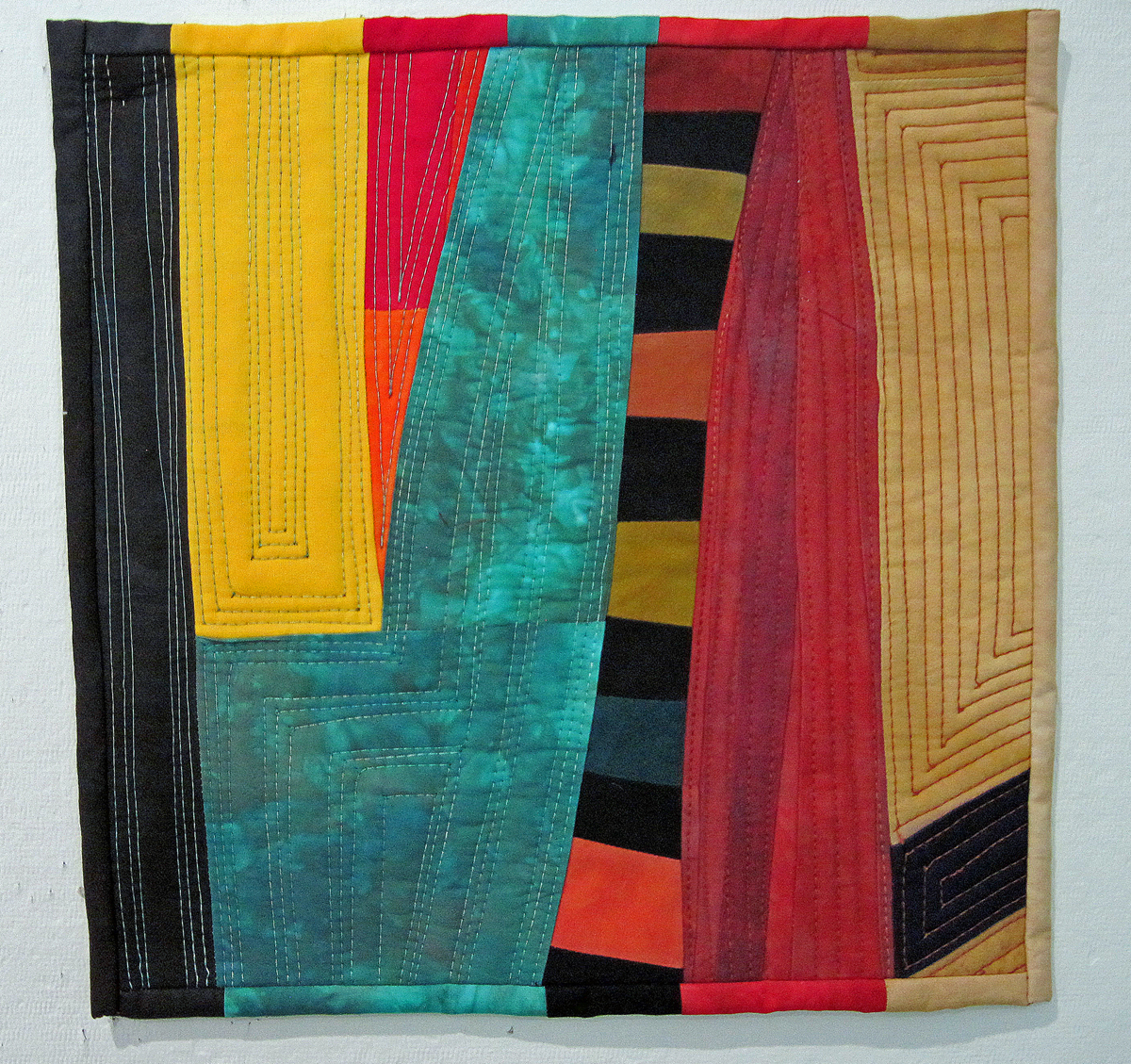 “My Battle with Parkinson: Balance 1” Size: 22″w x 22″h Materials and techniques: Cotton fabrics hand-dyed by Liz Axford and the artist, polyester quilting thread; machine pieced and quilted
