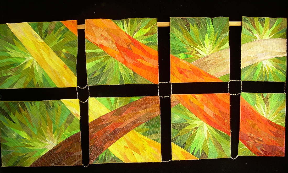Swaying Palms Fabrics hand dyed by the artist; machine collaged, appliqued & quilted 54″w x 26″h Sold