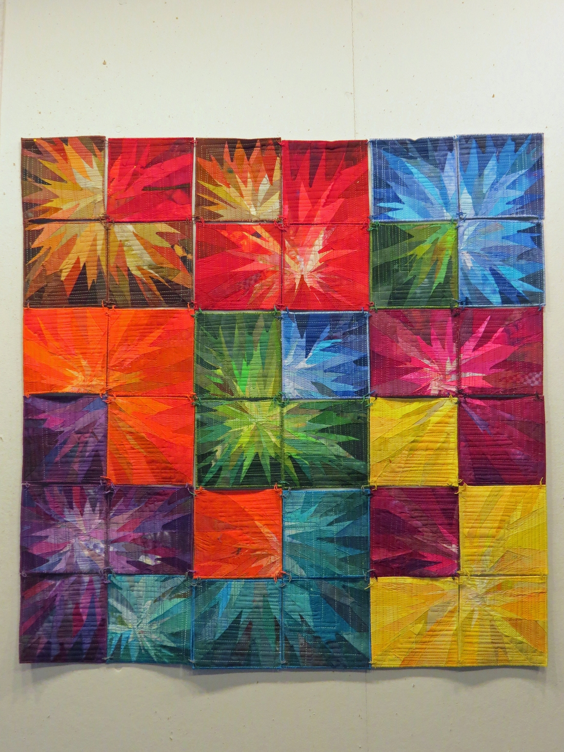 Fabrics hand dyed by the artist, polyester thread, telephone wire; machine collaged & quilted, hand joined by square knots