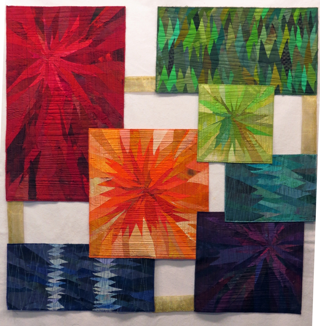 Fabrics hand dyed by the artist, brass designers mesh, acrylic rod; machine collaged & quilted
