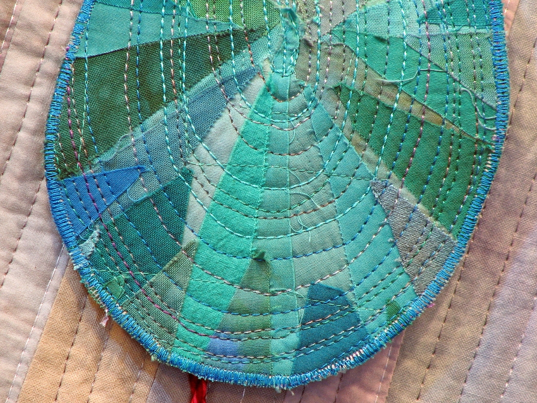 Fabrics hand dyed by the artist; machine pieced, collaged & quilted; appliqued twisted cord