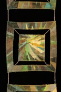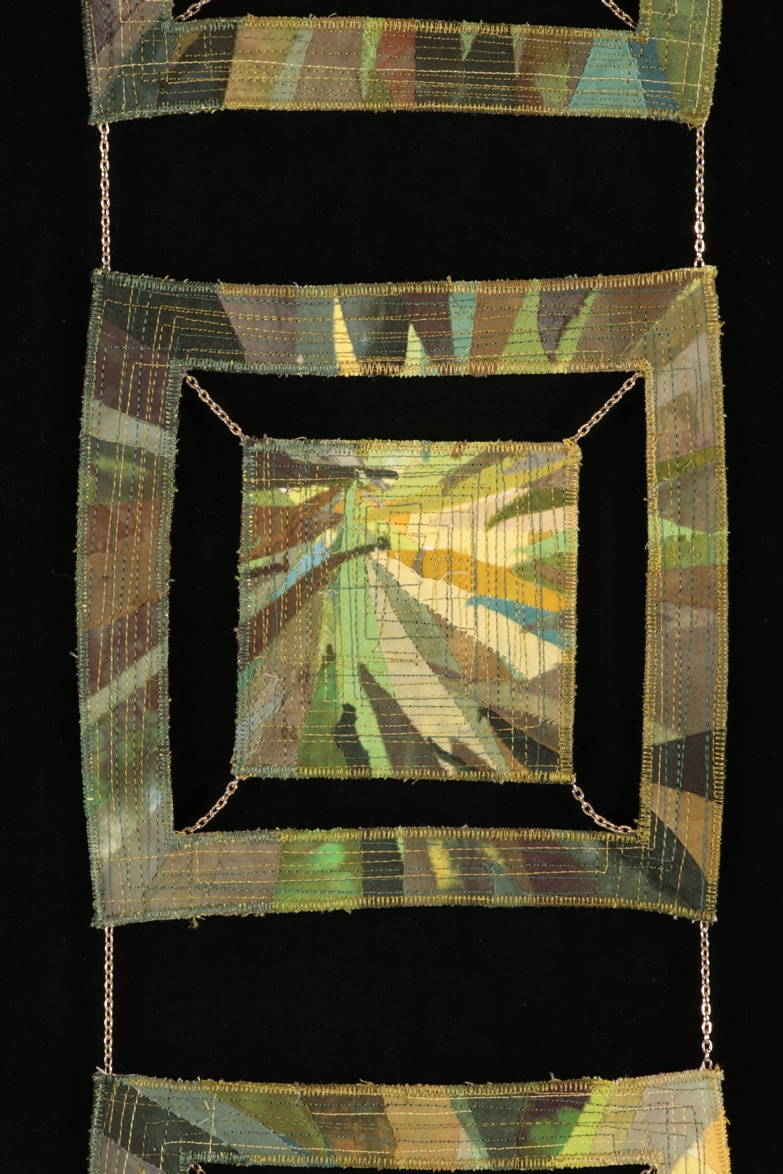 Fabrics hand dyed by the artist; machine collaged & quilted; chain & Plexiglas frame